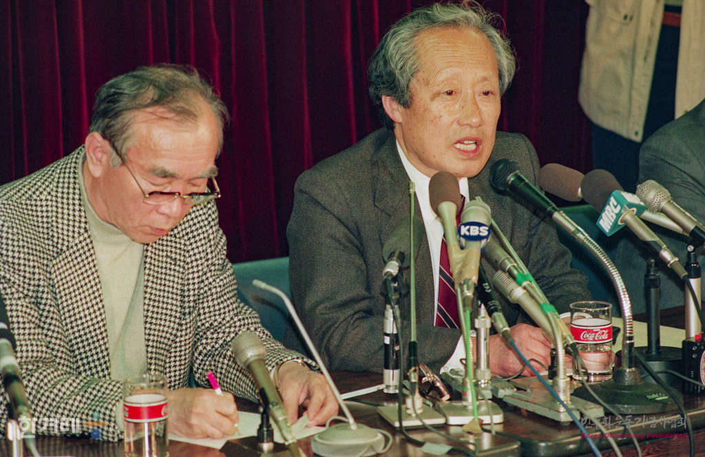 - 1989년 4월 5일 북한방문을 마치고 중국 민항 소속 925편으로 일본 도쿄에 도착한 문익환 목사가 일본 기독교교회협의회에서 기자회견을 갖고 있다. 왼쪽은 통역을 맡은 정경모씨