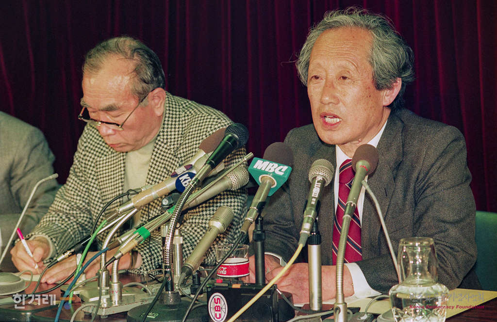 - 1989년 4월 5일 북한방문을 마치고 중국 민항 소속 925편으로 일본 도쿄에 도착한 문익환 목사가 일본 기독교교회협의회에서 기자회견을 갖고 있다. 왼쪽은 통역을 맡은 정경모씨