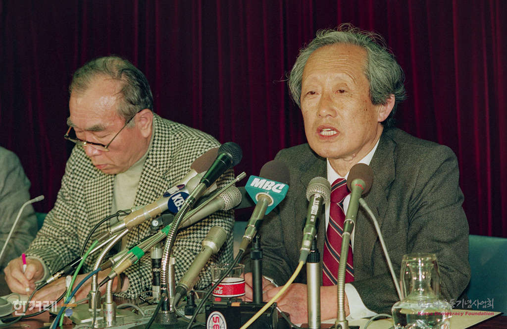 - 1989년 4월 5일 북한방문을 마치고 중국 민항 소속 925편으로 일본 도쿄에 도착한 문익환 목사가 일본 기독교교회협의회에서 기자회견을 갖고 있다. 왼쪽은 통역을 맡은 정경모씨