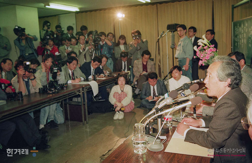 - 1989년 4월 5일 북한방문을 마치고 중국 민항 소속 925편으로 일본 도쿄에 도착한 문익환 목사가 일본 기독교교회협의회에서 기자회견을 갖고 있다. 왼쪽은 통역을 맡은 정경모씨