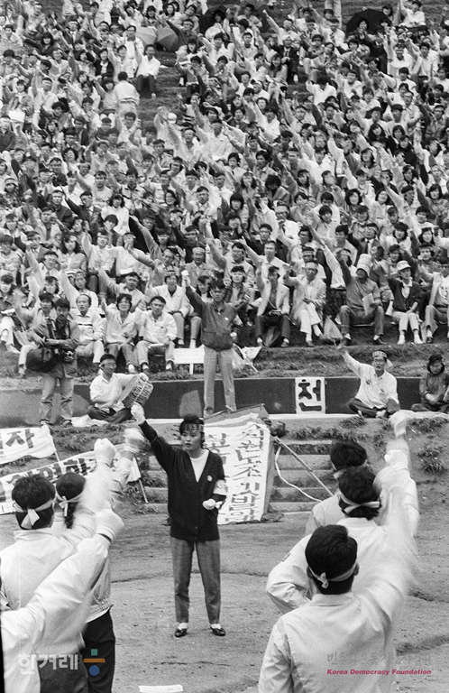 - 1989년 5월 14일 오후2시 전국교사협의회 소속 서울 인천 경기지역 교사들이 연세대 노천극장에서 서울 인천 경기지역 교직원노조 발기인대회 및 준비위원회 결성대회을 하고 있다. 이날 서울을 비롯한 부산 광주 등 전국 10개 지역에서 전국교직원 노조 발기인대회 및 준비위원회 결성대회를 갖고 노조준비위를 발족시켜 오는 28일 교직원 노조 결성대회를 열기로 결정함에 따라 이제 교직원노조 결성을 초읽기에 들어갔다.