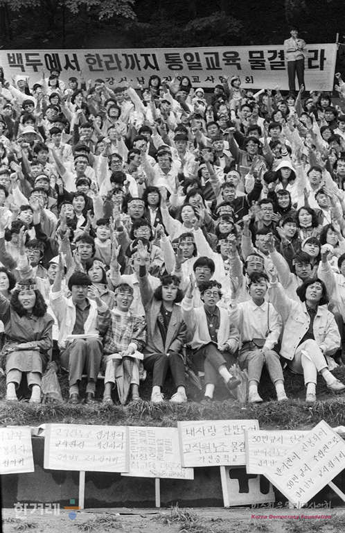 - 1989년 5월 14일 오후2시 전국교사협의회 소속 서울 인천 경기지역 교사들이 연세대 노천극장에서 서울 인천 경기지역 교직원노조 발기인대회 및 준비위원회 결성대회을 하고 있다. 이날 서울을 비롯한 부산 광주 등 전국 10개 지역에서 전국교직원 노조 발기인대회 및 준비위원회 결성대회를 갖고 노조준비위를 발족시켜 오는 28일 교직원 노조 결성대회를 열기로 결정함에 따라 이제 교직원노조 결성을 초읽기에 들어갔다.