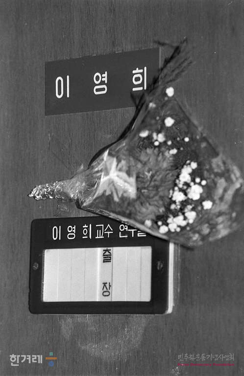 - 1989년 5월 15일 한겨레신문 북한취재계획 관련해서 구속된 서울 성동구 사근동 한양대 이영희교수 연수실에 스승의 날을 맞아 학생들이 붙여놓은 카네이션이 걸려있다.