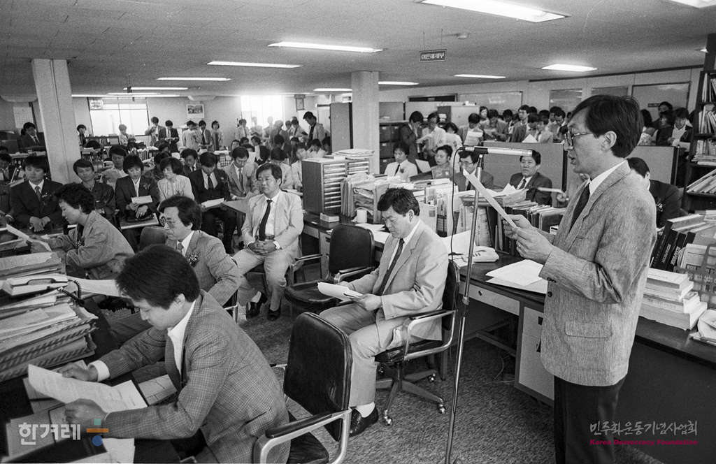 - 1989년 5월 15일 한겨레신문은 오전 9시 30분 서울 영등포구 양평동 본사 2층 편집국에서 본사 임직원 창간위원 및 지국장과 독자등 3백여명이 참석한 가운데 창간 1돌 기념식을 하고 있다,