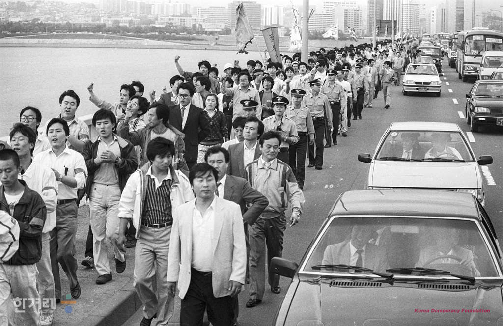 - 1989년 5월 16일 경기대 대학생과 교수 및 교직원들이 사학비리척결과 학원자율화를 주장하며 여의도까지 평화행진을 하고 있다.