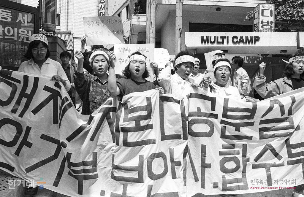 - 1989년 5월 19일 민주화실천가족운동협의회 회원들이 서울 중구 정동 서울지법앞에서 양심수 전원석방과 공안합수부와 안기부 해체, 국가보안법 사회안전법 폐지 등을 요구하며 시위를 벌이고 있다.