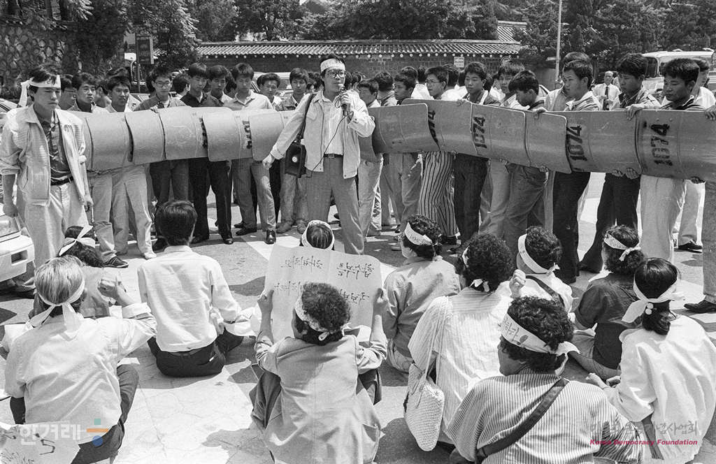 - 1989년 5월 22일 민주화실천가족운동협의회 회원들이 서울 중구 정동 서울지법앞에서 양심수 전원석방과 공안합수부와 안기부 해체, 국가보안법 사회안전법 폐지 등을 요구하며 시위를 벌이고 있다.