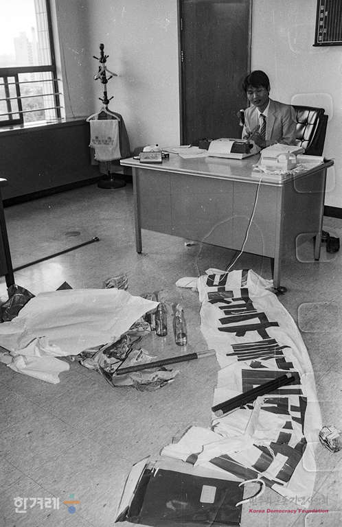 - 1989년 5월 20일 한신대생 조영삼씨 등 민중운동 탄압분쇄 학살원흉 처단을 위한 청년학생결사대 소속 대학생 4명이 수원시 원천동 수원지방 검찰청 3층 공안담당 문장운 검사실을 점거하고 농성을 하다 10분만에 강제연행된 뒤 학생들이 남기고 간 현수막과 화염병이 사무실에 놓여있다.