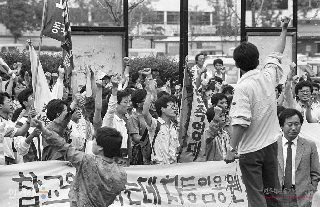 - 1989년 5월 20일 전국 사립사법대학협의회 소속 학생들이 정부가 교원적재해소에 나서줄 것을 촉구하며 거리행진을 통해 종로5가 종묘앞 광장에서 마무리 집회를 하고 있다.