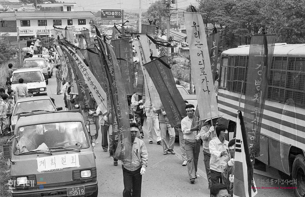 - 1989년 5월 21일 오전 10시30분 정부의 경기도 일산 분당 새도시 건설계획에 대한 현지 주민들의 반대활동이 계속되는 가운데 정부의 토지수용 계획으로 인해 재산사으이 손실로 빚에 쫓겨 살충제를 마시고 숨진 강병채씨의 장례식이 경기도 고양군 일산읍 백석6리 백마초등학교 운동장에 열려 영결식을 마친 주민들이 만장을 앞세우고 노제를 하기 위해 군청으로 행진하고 있다.