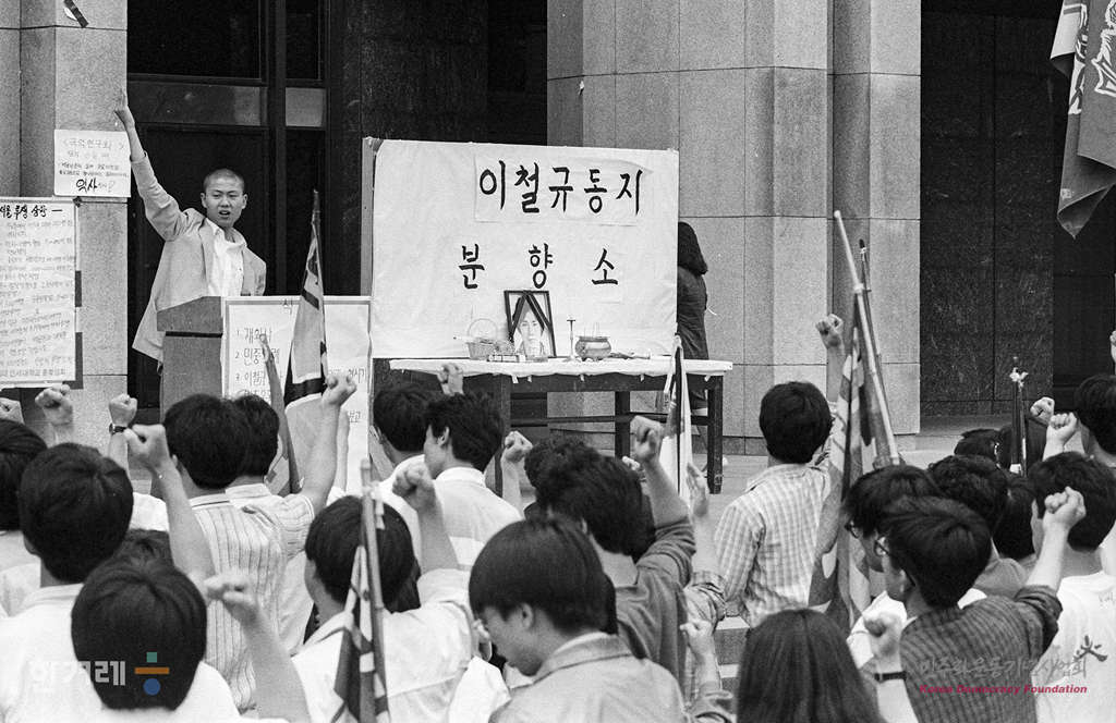- 1989년 5월 22일 전대협은 반미투쟁의 날로 선포하고 미국의 광주항쟁 개입을 항의하는 각종 집회 시위를 계획하는 가운데 서울 연세대 민주광장에서 반미주간을 알리는 선전탑이 설치되어 있다. 한편에는 지난 10일 광주 청옥동 제4수원지에서 변사체로 발견된 이철규 조선대 교지편집위원장의 분향소가 설치되어 있다.