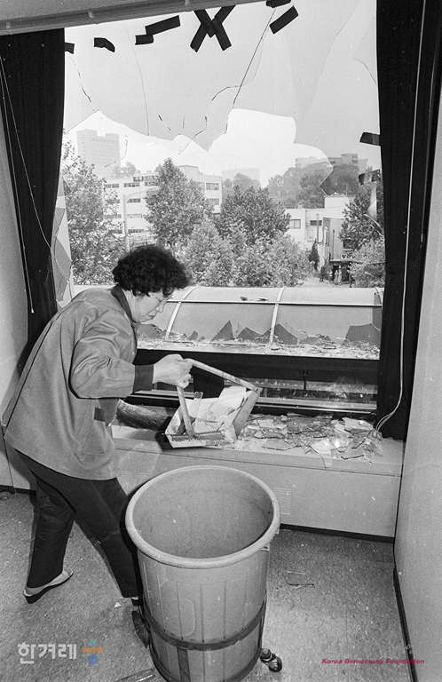 - 1989년 5월 22일 오전 9시 15분께 서울시내 10개 대학 학생 16명이 서울 서대문구 미근동 치안본부 별관 2층 복도를 점거 공안합수부 해체 등을 요구하며 농성을 벌이다 15분만에 연행된 뒤 관계자들이 점거도중 부서진 유리창을 치우고 있다.