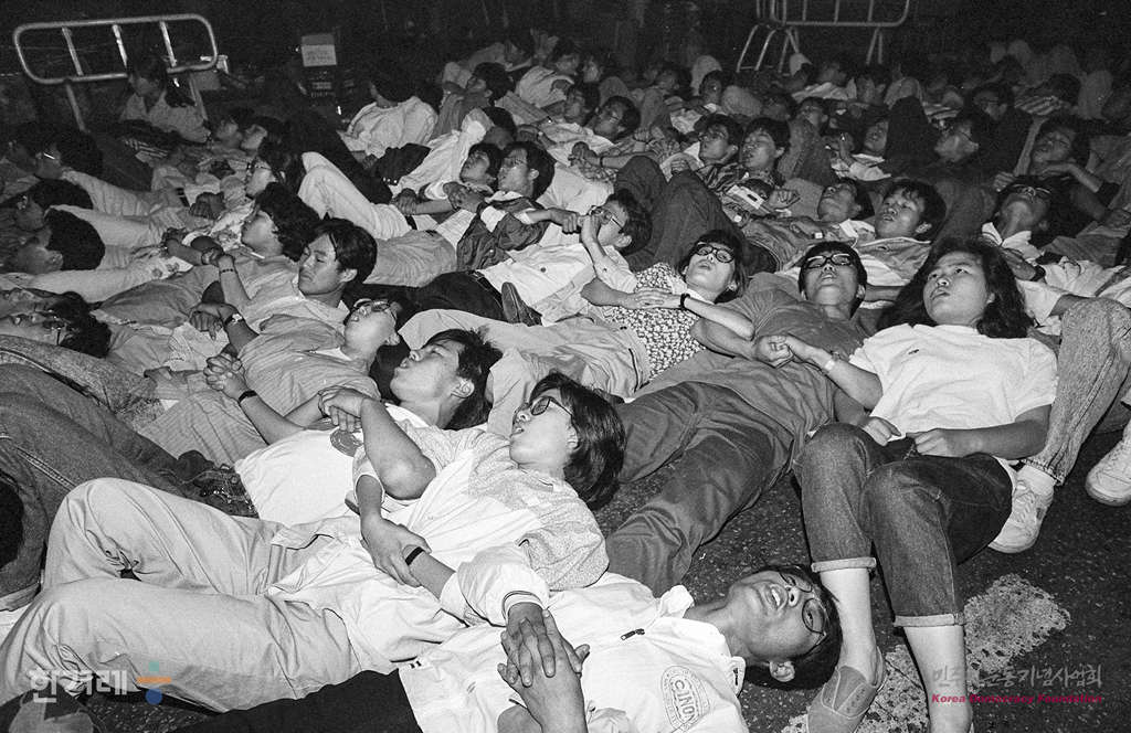 - 1989년 5월 23일 서총련주최로 서울시청앞에서 열릴 예정이던 이철규 고문살인 진상규명 및 광주학살주범 노태우 퇴진을 위한 백만학도 총궐기대회가 경찰의 원천봉쇄로 무산되자 일부 대학생들으 퇴계로 남대문시장 입구에서 도로를 점거한 채 시위를 벌이다 경찰에 연행되고 있다.