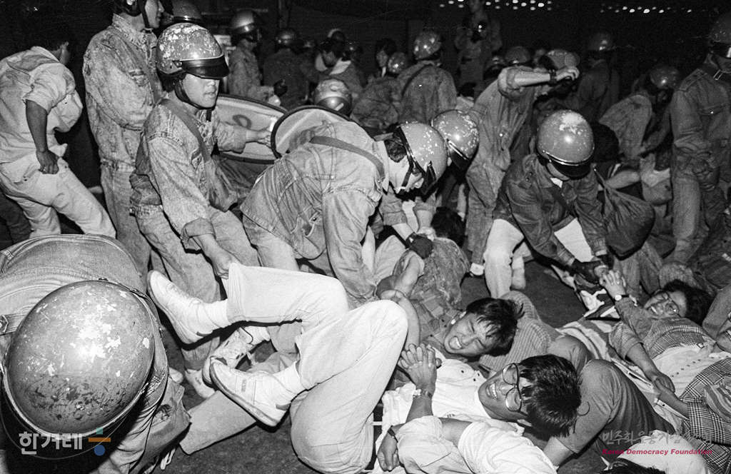 - 1989년 5월 23일 서총련주최로 서울시청앞에서 열릴 예정이던 이철규 고문살인 진상규명 및 광주학살주범 노태우 퇴진을 위한 백만학도 총궐기대회가 경찰의 원천봉쇄로 무산되자 일부 대학생들으 퇴계로 남대문시장 입구에서 도로를 점거한 채 시위를 벌이다 경찰에 연행되고 있다.