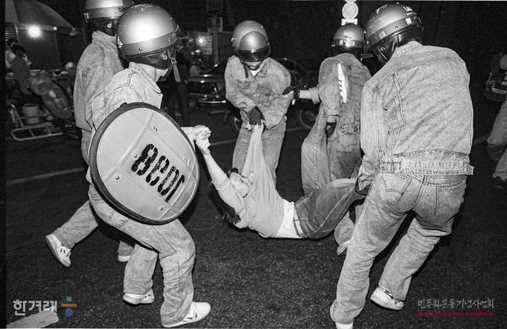 - 1989년 5월 23일 서총련주최로 서울시청앞에서 열릴 예정이던 이철규 고문살인 진상규명 및 광주학살주범 노태우 퇴진을 위한 백만학도 총궐기대회가 경찰의 원천봉쇄로 무산되자 일부 대학생들으 퇴계로 남대문시장 입구에서 도로를 점거한 채 시위를 벌이다 경찰에 연행되고 있다.