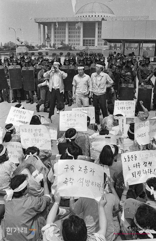 - 1989년 5월 24일 11시 서울 인천 부천 울산지역 등 전국구속노동자가족협의회 소속 회원 50여명은 서울 영등포구 여의도동 국회의사당 정문앞에서 구속노동자 석방등을 요구하며 연좌농성을 벌이다 경찰에 전원 연행되고 있다.