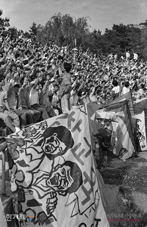 - 1989년 5월 24일 전국 교직원노조 결성대회를 사흘 앞두고 교사 5백여명이 서울 연세대 노천극장에서 교직원노조탄압규탄대회를 열고 있다.