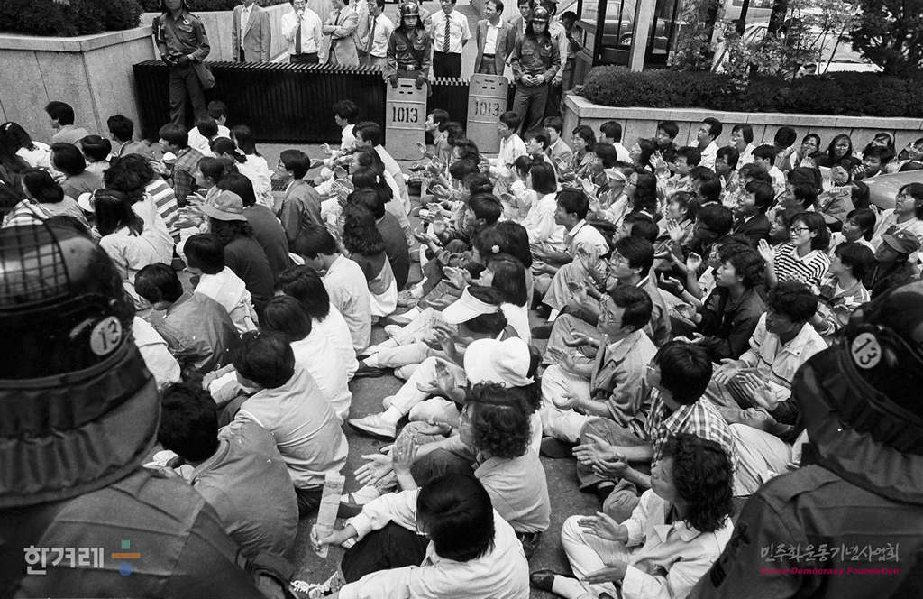 - 1989년 5월 26일 서울대 전남대 부산대 등 전국 13개 국공립사범대학생 2천명은 서울대 노천극장에서 문교부 교원임용 종합대책안 결사저지를 위한 문교부 항의방문 출정식을 가진 뒤 광화문네거리에서 문교부가 있는 종합청사앞까지 행진을 벌이려 했으나 경찰에 의해 연행되고 있다.