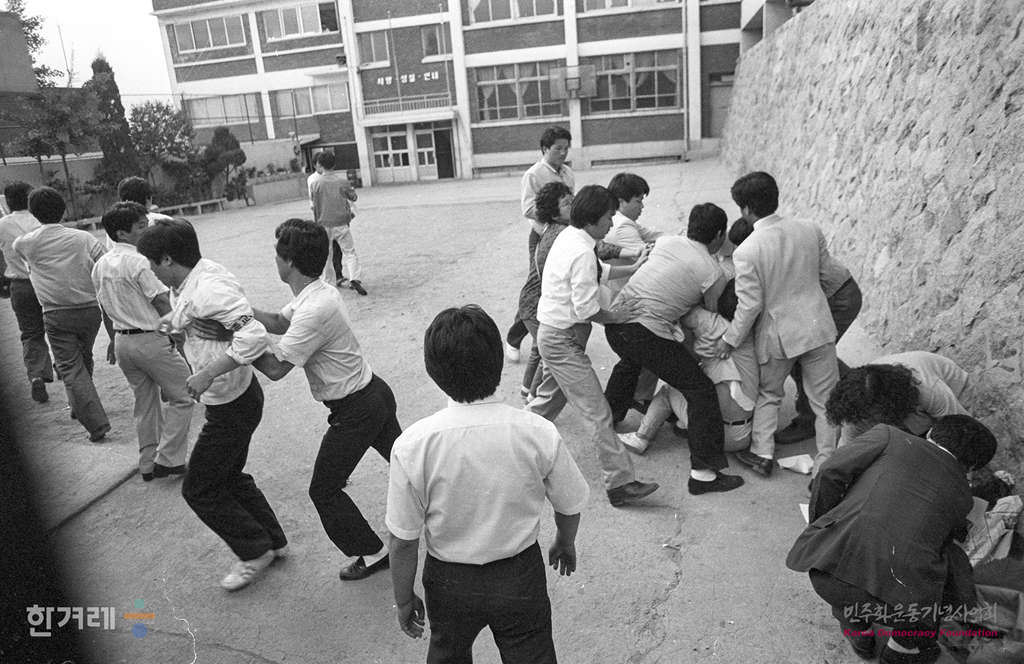 - 1989년 5월 26일 오후 6시30분 서울 유성전자공업학교 교사 10명이 교내 운동장에서 교직원노조 유성전자공업학교 분회 준비위원회 결성대회를 가지려하자 경찰과 학교 관계자들이 저지하고 있다.