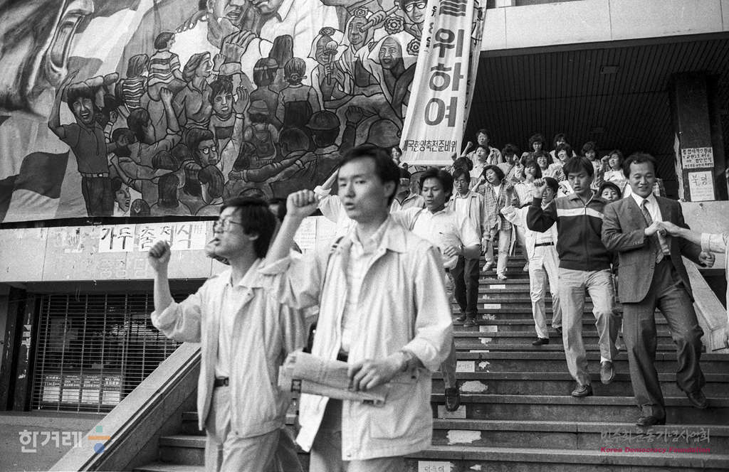 - 1989년 5월 27일 전국 각 지역에서 모인 교사 1백여명이 전국교직원노동조합의 결성식에 열린 예정인 서울 한양대에 모여 경찰의 원천봉쇄에서 불구하고 28일 결성대회를 강행키로 결의하고 있다.