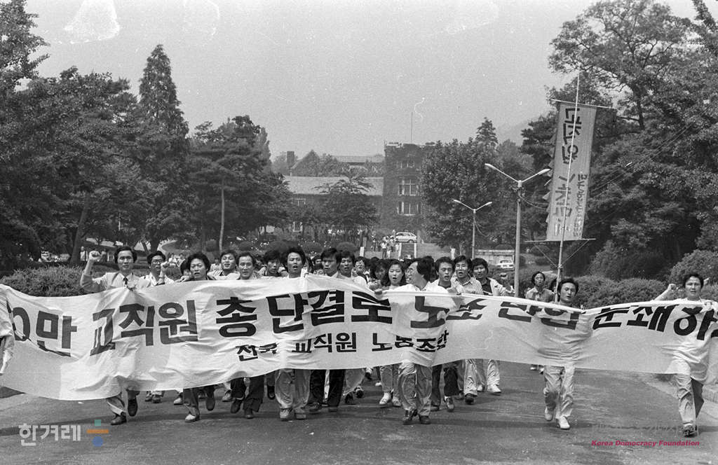 - 1989년 5월 28일 오후 1시 30분 전국교직원노조 윤형규 위원장을 비롯한 소속 교사들이 연세대 도서관앞 민주광장에서 전격적으로 결성대회를 갖고 전교조 결성 선언을 하고 있다. 애초 예정된 서울 한양대가 경찰에 의해 봉쇄하자 대회 장소를 옮겨 결성식을 가졌다.