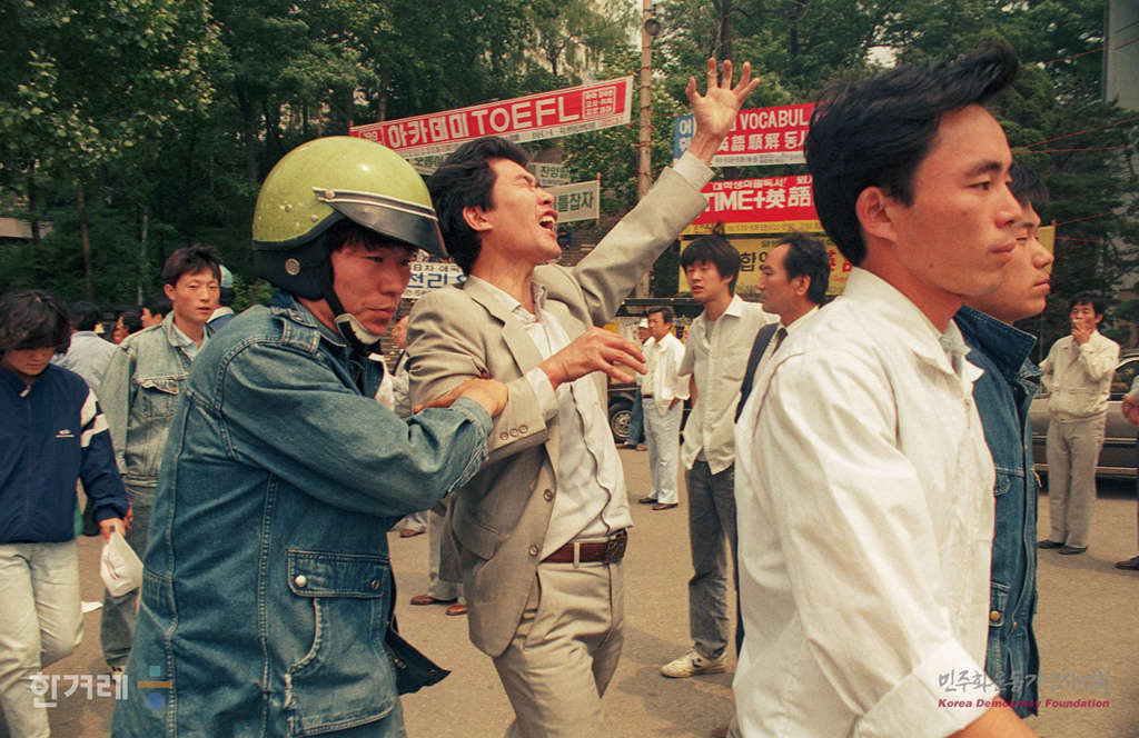 - 1989년 5월 28일 오후 1시 30분 전국교직원노조 소속 교사들이 한양대 학생회관에서 결성대회를 강행할 것을 결의하다 경찰에 연행되고 있다. 일부는 애초 예정된 서울 한양대가 경찰에 의해 봉쇄하자 대회 장소를 연세대로 옮겨 결성식을 가졌다.