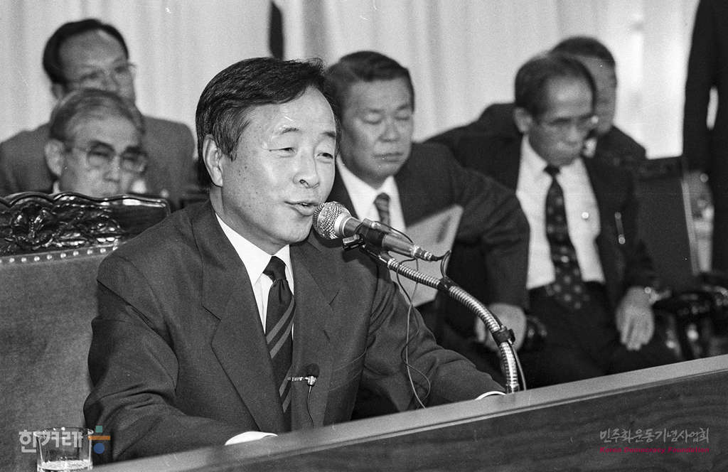 - 1989년 5월 30일 노태우대통령과 청와대회담을 앞두고 있는 김영삼 민주당 총재가 민주당에서 광주 및 5공청산문제 등 정치현안 문제와 5공핵심인사 처리문제, 교직원노조 결성문제 등 회담의제에 대한 입장을 밝히는 기자회견을 하고 있다.