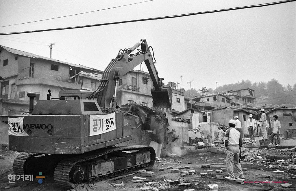 - 1989년 5월 30일 오전 10시 서울 동작구 사당2동 산14 재개발지역에서 재개발조합쪽 철거반원들이 경찰들이 비호를 받으며 빈집 2백여채의 철거를 강행하고 있다.