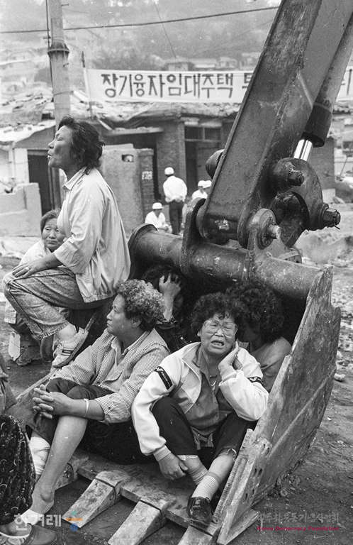 - 1989년 5월 30일 오전 10시 서울 동작구 사당2동 산14 재개발지역에서 재개발조합쪽 철거반원들이 경찰들이 비호를 받으며 빈집 2백여채의 철거를 강행하자 세입자들이 포크레인 버켓에 들어가 철거를 저지하고 있다.