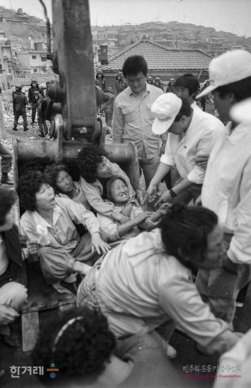 - 1989년 5월 30일 오전 10시 서울 동작구 사당2동 산14 재개발지역에서 재개발조합쪽 철거반원들이 경찰들이 비호를 받으며 빈집 2백여채의 철거를 강행하자 세입자들이 포크레인 버켓에 들어가 철거를 저지하고 있다.