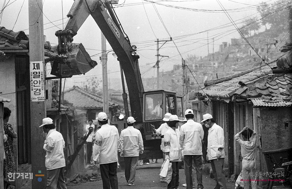 - . 1989년 5월 30일 오전 10시 서울 동작구 사당2동 산14 재개발지역에서 재개발조합쪽 철거반원들이 경찰들이 비호를 받으며 빈집 2백여채의 철거를 강행하고 있다.