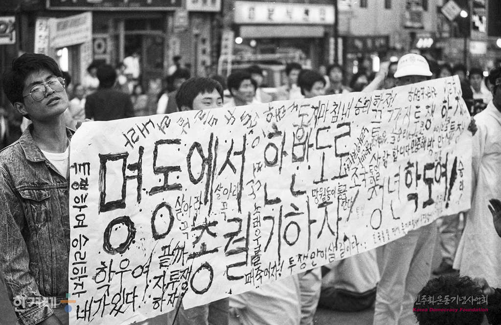 - 1989년 5월 31일 이철규씨 사인진상규명을 요구하며 명동성당에서 단식농성중인 학생들과 합류하기 위해 대학생들이 피로쓴 현수막을 들고 명동성당에 가고 있다