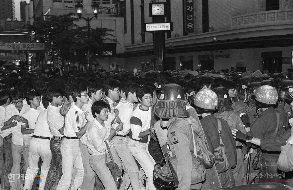 - 1989년 5월 31일 이철규씨 사인진상규명을 요구하며 명동성당에서 단식농성중인 학생들과 합류하기 위해 명동성당에 가려던 서울시내 대학생들이 명동 제일백화점 앞에서 경찰에 막히자 항의를 하며 몸싸움을 벌이고 있다