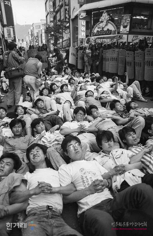 - 1989년 5월 31일 이철규씨 사인진상규명을 요구하며 명동성당에서 단식농성중인 학생들과 합류하기 위해 명동성당에 가려던 서울시내 대학생들과 시민들이 명동 제일백화점 앞에서 경찰에 막히자 거리에 누워 항의를 하고 있다.