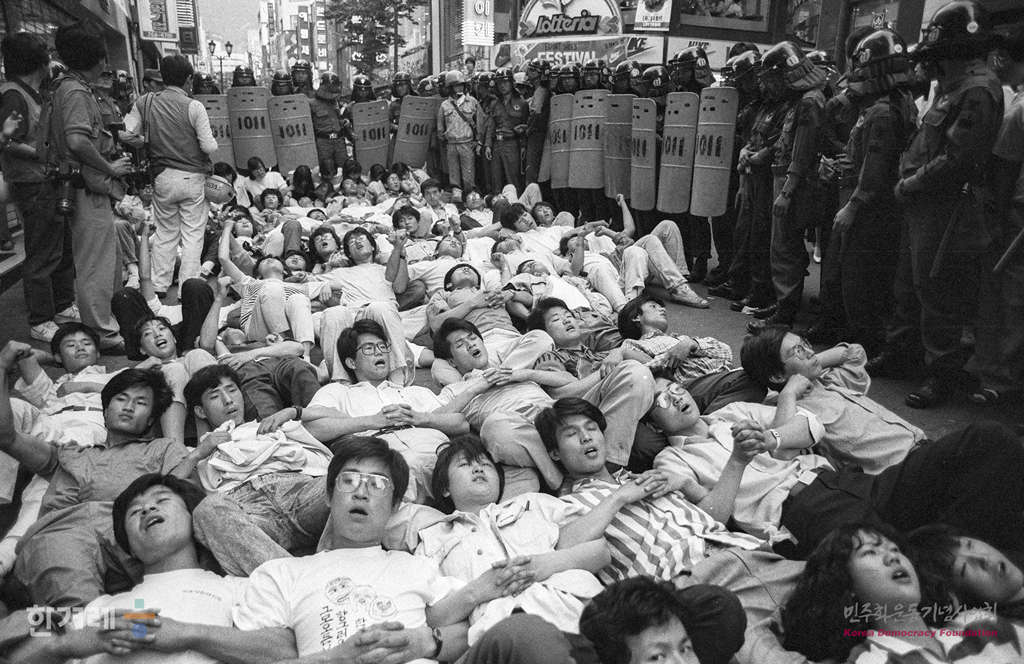 - 1989년 5월 31일 이철규씨 사인진상규명을 요구하며 명동성당에서 단식농성중인 학생들과 합류하기 위해 명동성당에 가려던 서울시내 대학생들과 시민들이 명동 제일백화점 앞에서 경찰에 막히자 거리에 누워 항의를 하고 있다.