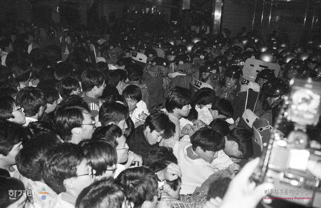 - 1989년 5월 31일 이철규씨 사인진상규명을 요구하며 명동성당에서 단식농성중인 학생들과 합류하기 위해 명성성당에 가려던 서울시내 대학생들이 명동 제일백화점 앞에서 경찰에 막히자 항의를 하며 몸싸움을 벌이고 있다