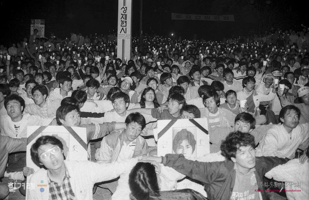 - 1989년 5월 31일 오후6시 명동성당 단식농성자와 경찰의 저지선을 뚫고 합류한 5백여명이 이철규씨 사인규명과 광주학살 책임자 처단을 요구하는 집회를 하고 있다.