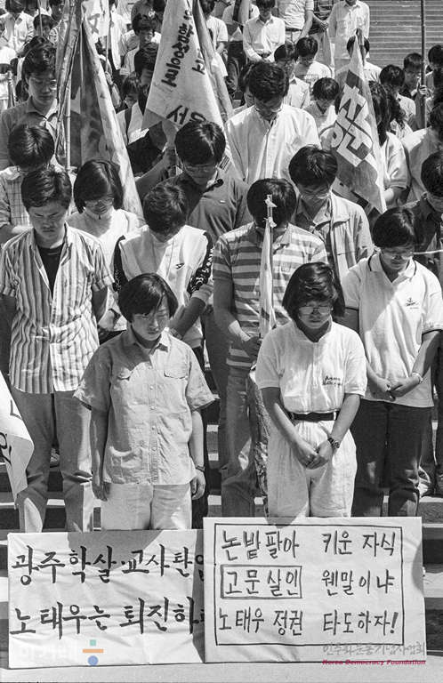 - 1989년 5월 31일 서울대 대학생들이 교내 아크로폴리스광장에서 명동성당 구국단식 지지결의대회를 갖고 있다,. 이들은 교내집회를 마친 뒤 명동성당 단식중인 학생들과 결합할 예정이다.