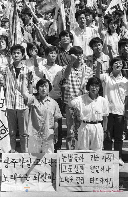 - 1989년 5월 31일 서울대 대학생들이 교내 아크로폴리스광장에서 명동성당 구국단식 지지결의대회를 갖고 있다,. 이들은 교내집회를 마친 뒤 명동성당 단식중인 학생들과 결합할 예정이다.