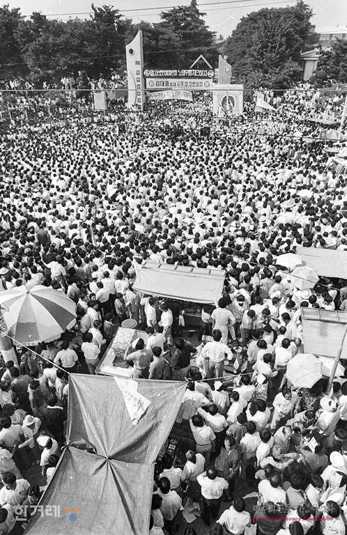 - 1989년 6월 3일 광주항쟁의 책임자 처리와 조선대생 이철규씨 사인규명을 요구하는 시위가 계속되는 광주지역에 4.26총선 이후 1년여만에 김대중 평민당 총재가 광주교대 교정에서 열린 시국강연에 남대협 소속 학생들이 김총재와 사전면담과 평민당 각성을 요구하는 시위를 벌이고 있다.