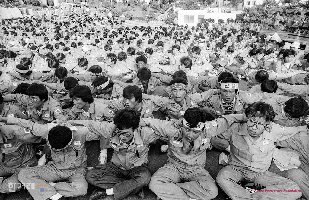 - 1989년 5월 31일 오전 8시 30분 대우조선 노조원 9천여명은 지난 29일 회사 기숙사에서 임금인상동결과 노조분열기도에 항의하며 분신으로 숨을 거둔 고 이상모열사 장례 절차 보고 및 사용자 규탄대회를 열고 있다.