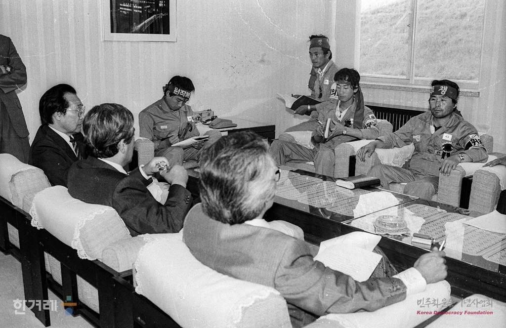 - 1989년 5월 31일 거제 대우조선 노조 양동생 위원장이 회사대표와 지난 29일 회사 기숙사에서 임금인상동결과 노조분열기도에 항의하며 분신으로 숨을 거둔 이상모씨의 장례절차에 협의를 하고 있다.