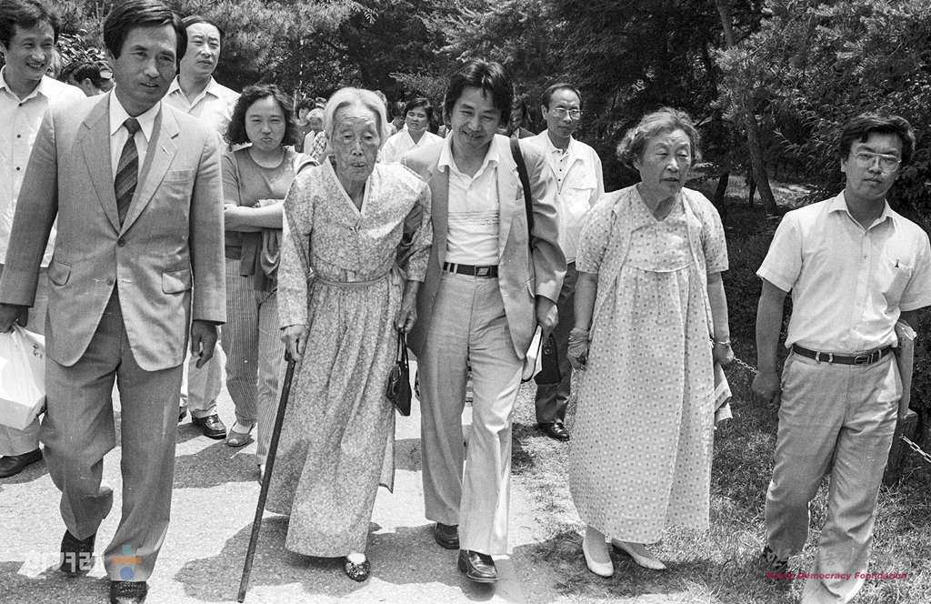 - 1989년 6월 1일 오후1시 문익환 목사의 일흔한번째 생일을 맞아 경기도 안양시 호계3동 안양교도소에서 노모 김신묵시와 부인 박용길 장로가 문목사를 면회한 뒤 나오고 있다.