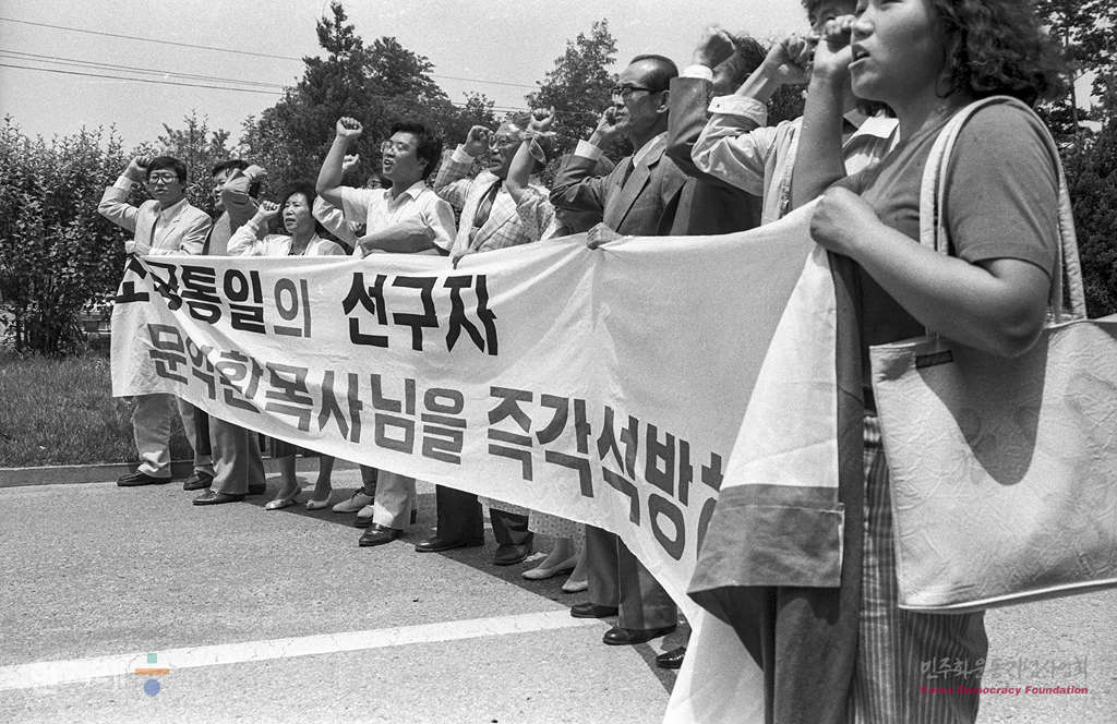 - 1989년 6월 1일 오후1시 문익환 목사의 일흔한번째 생일을 맞아 경기도 안양시 호계3동 안양교도소에서 노모 김신묵시와 부인 박용길 장로를 비롯한 지안들이 문목사를 면회한 뒤 석방을 촉구하며 시위를 벌이고 있다.
