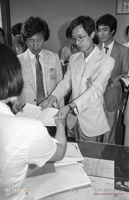 - 1989년 6월 1일 오후 2시 50분 지난달 28일 노조를 결성한 전국교직원노조 임시집행부 상임위원 배춘일씨와 법규분과 위원장 이철국교사가 서울 노동부 민원상담실에 노조설립신고서를 접수시키고 있다.
