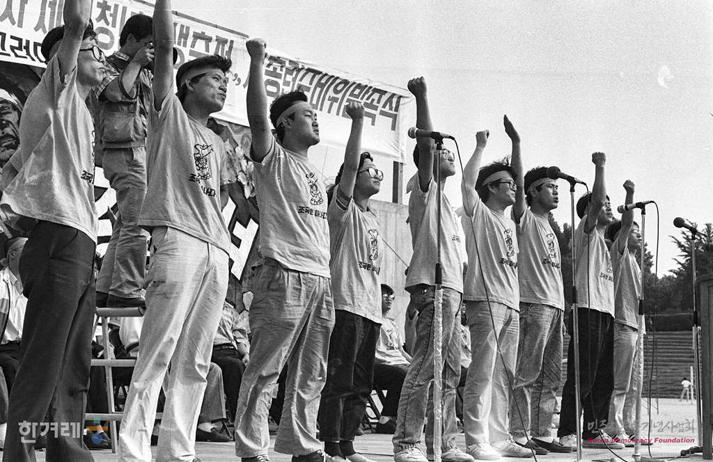 - 1989년 6월 2일 오후4시 서총련 소속 대학생들이 서울 고려대학교 대운동장에서 조국의 평화통일을 위한 제13차 세계청년학생축전 서총련 준비위 발족식을 하고 있다.