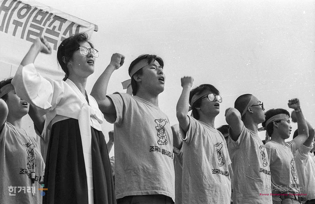 - 1989년 6월 2일 오후4시 서총련 소속 대학생들이 서울 고려대학교 대운동장에서 조국의 평화통일을 위한 제13차 세계청년학생축전 서총련 준비위 발족식을 하고 있다.