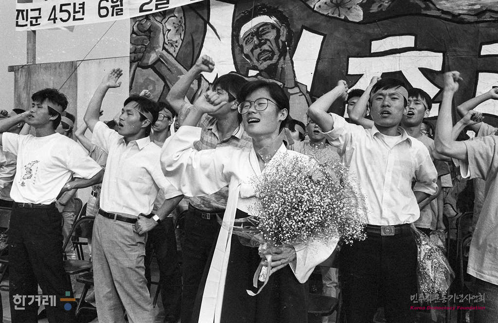 - 1989년 6월 2일 오후4시 서총련 소속 대학생들이 서울 고려대학교 대운동장에서 조국의 평화통일을 위한 제13차 세계청년학생축전 서총련 준비위 발족식을 하고 있다.