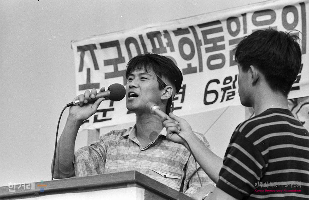 - 1989년 6월 2일 오후4시 서총련 소속 대학생들이 서울 고려대학교 대운동장에서 조국의 평화통일을 위한 제13차 세계청년학생축전 서총련 준비위 발족식을 하고 있다.