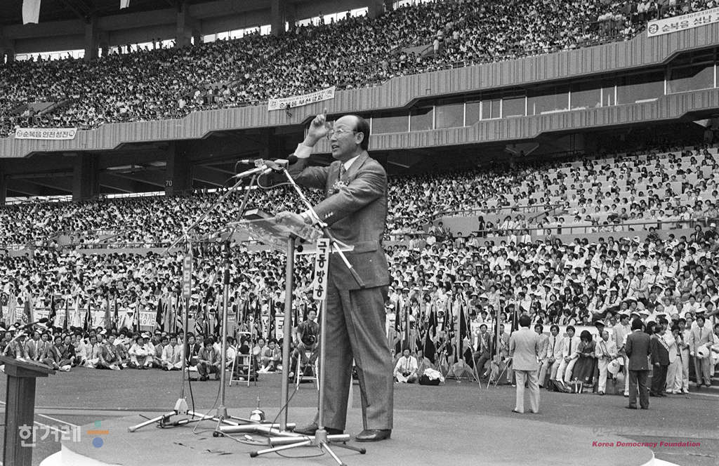 - 1989년 6월 2일 서울 여의도 순복음교회의 구국과 통일을 위한 기도회가 서울 잠실올림픽 경기장에서 열려 10만명의 신도가 참석한 가운데 조용기 목사가 연설을 하고 있다.